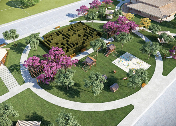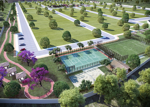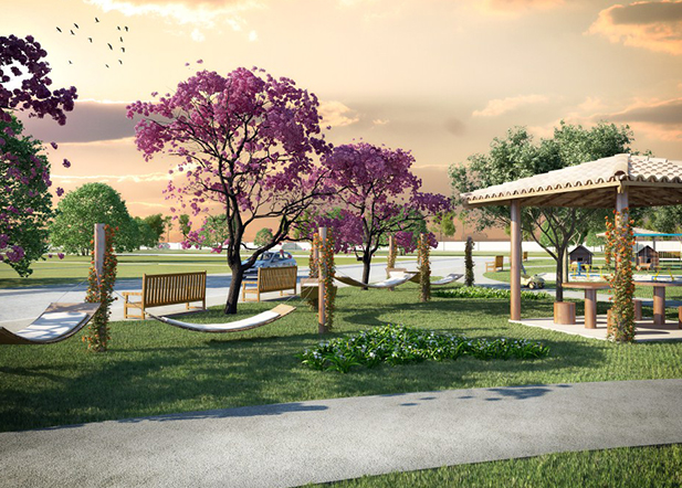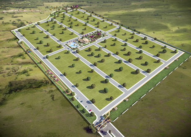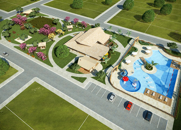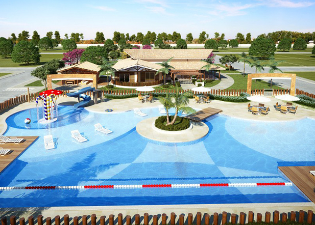 De forma conservadora, apresentamos um loteamento com grande potencial financeiro e custo moderado, onde buscamos concentrar as construções em uma grande praça central e destacamos o parque aquático do condomínio.